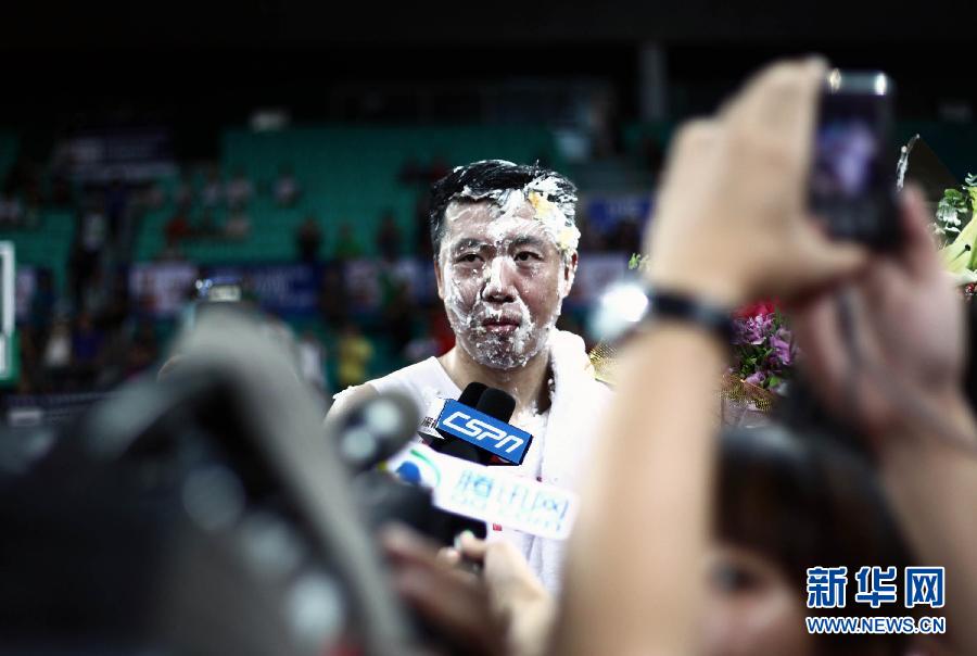 7月8日,被抹了一臉蛋糕的中國隊球員王治郅賽后接受采訪。當日,在廣州進行的斯坦科維奇杯洲際籃球賽比賽中,中國隊以73比67戰勝俄羅斯隊。王治郅在賽場上度過了35歲的生日。新華社記者白雪飛攝