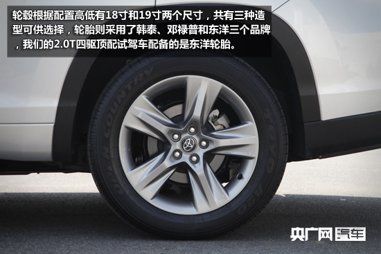車輪輪轂根據配置高低有18寸和19寸兩個尺寸,共有三種輪轂造型可供選擇,輪胎則采用了韓泰、鄧祿普和東洋三個品牌,其中我們的2.0T四驅頂配試駕車配備的是東洋輪胎。如果想辨識全新漢蘭達是2.0T版還是3.5L V6版,最容易的辦法就是看尾標,2.0T版的尾標是D-4ST,而3.5L V6版則清晰的表明了V6(六缸發動機)身份。