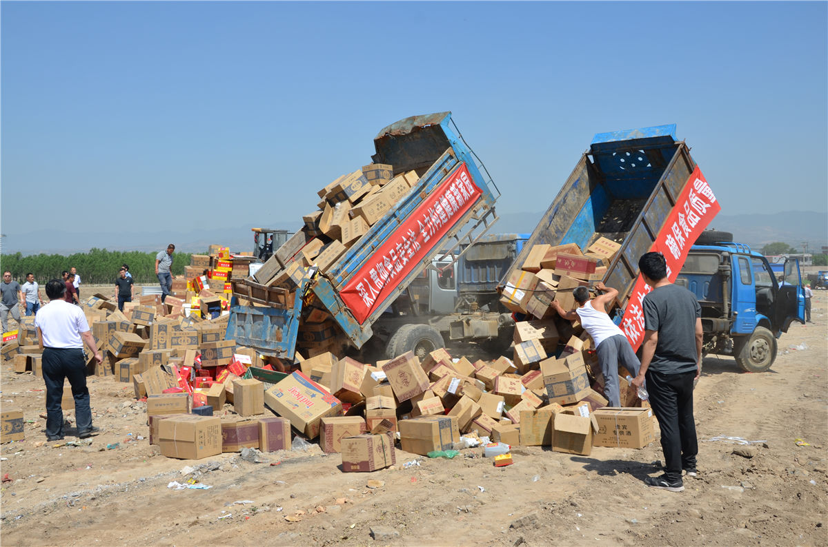 集中銷毀“三無”白酒,汾陽市食藥局集中銷毀“三無”及劣質白酒、配制酒,共計1600余箱,貨值金額27萬余元。