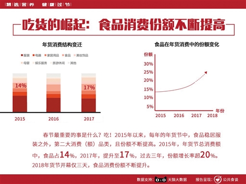據(jù)科信食品與營(yíng)養(yǎng)信息交流中心副主任鐘凱介紹,2015年至2018年天貓年貨節(jié)大數(shù)據(jù)顯示,公眾在線采購(gòu)的食品類(lèi)消費(fèi)額占比不斷提升,且食物種類(lèi)也日趨多樣化。