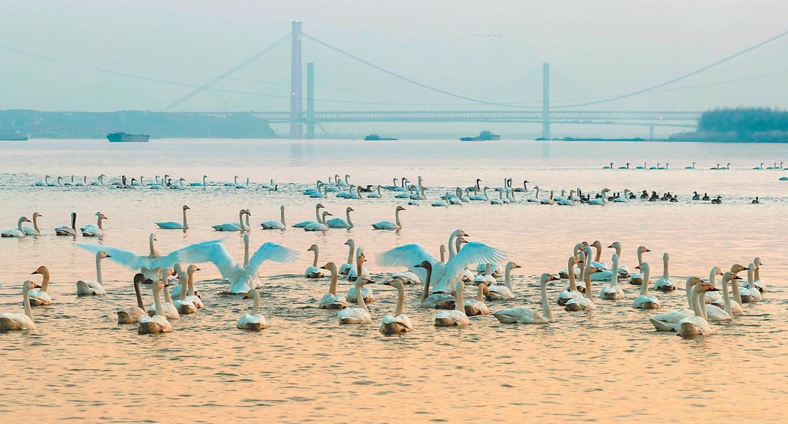 長江安徽銅陵段江面,成群候鳥在覓食嬉戲,勾勒出人與自然和諧共生的美好圖景。