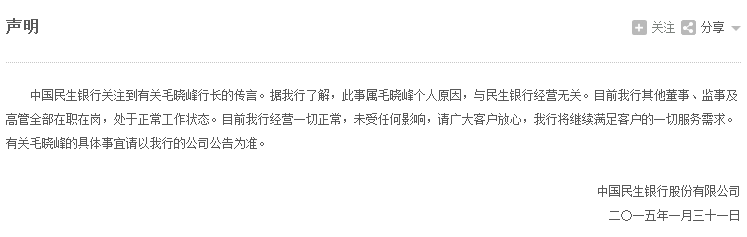 業內普遍認為,民生銀行發布公告對此事進行回應已經從側面證實此前毛曉峰的相關傳言。