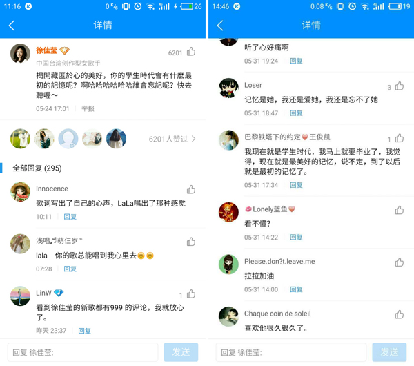 在《最初的記憶》的評論區里,萌萌的LaLa調皮地向粉絲發問:“揭開藏匿于心的美好,你的學生時代會有什么最初的記憶呢?”面對她的感性發問,眾粉絲開始自曝戀愛故事,美好的,心酸的。當然,還有不少粉絲排隊表白。不知道LaLa會為哪位粉絲的故事而感動呢?