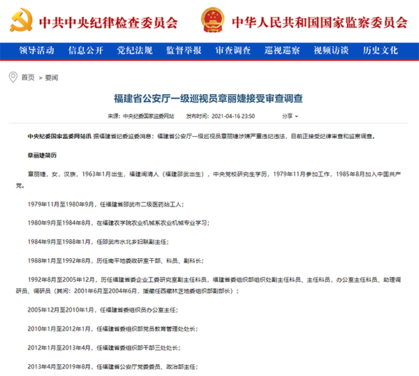 央廣網(wǎng)福州4月17日消息 福建省公安廳一級巡視員章麗婕涉嫌嚴(yán)重違紀(jì)違法,目前正接受紀(jì)律審查和監(jiān)察調(diào)查。