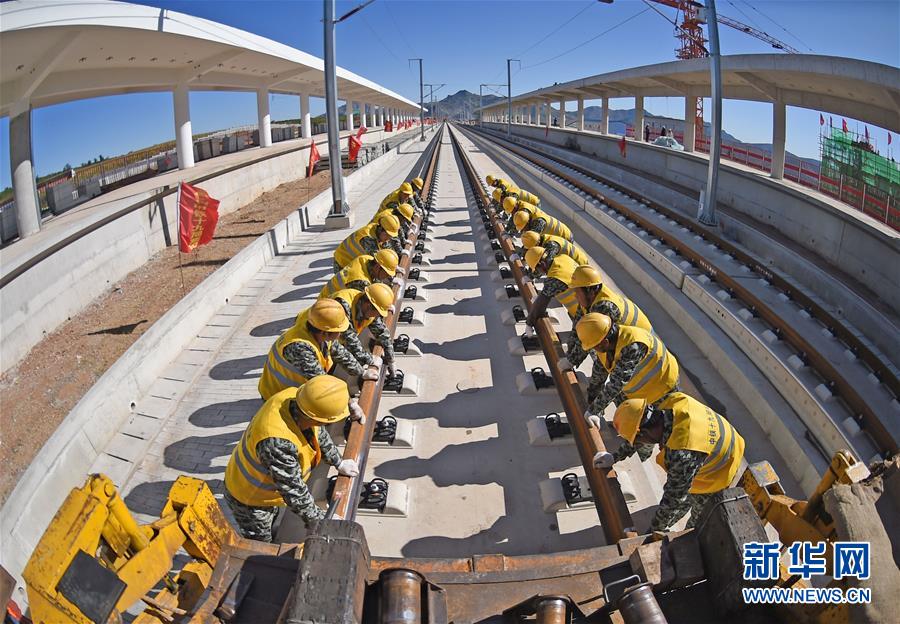 •   中鐵十九局工程人員在京沈高鐵凌源南站進行鋪軌作業(9月28日攝)。京沈高鐵起自北京星火站,經河北省承德市、遼寧省朝陽市、阜新市接入沈陽站,線路全長698公里,設計時速350公里。今年開跑的“復興號”在京滬高鐵實現350公里時速運營,再次創造了領先世界的中國速度。目前,中國鐵路在勘察設計、工程建造、高速動車組、列車控制、牽引供電、運營管理、安全保障等領域已經取得一系列自主創新成果,中國鐵路總體技術水平已邁入世界先進行列,部分技術處于世界領先水平。作為中國“新四大發明”之一,高鐵不僅安全、便利、快捷地服務著中國旅客,同時也驚艷著世界。新華社記者 楊青 攝