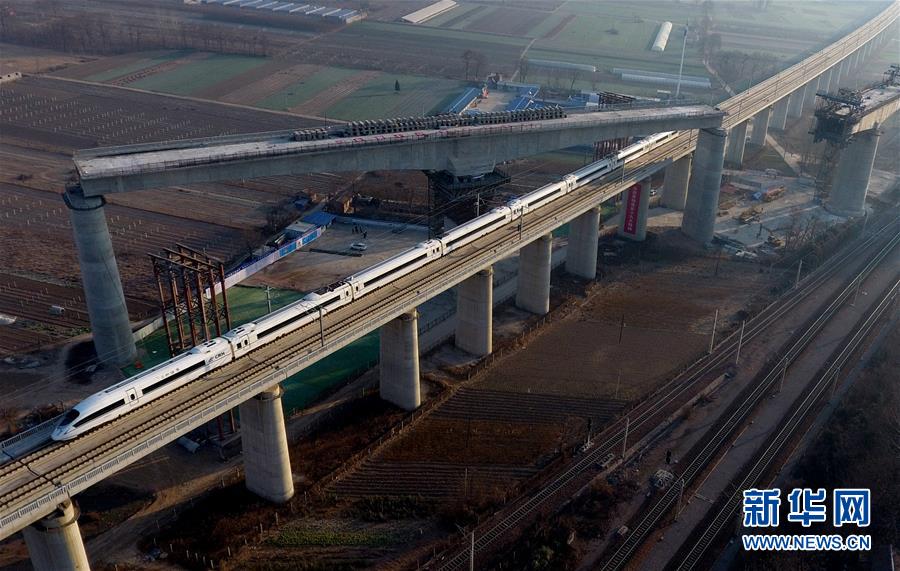 •   12月19日,一列高鐵從轉體成功后的商合杭高鐵跨鄭徐高鐵T構梁下駛過。商合杭高鐵線路全長794.55公里,設計時速350公里。今年開跑的“復興號”在京滬高鐵實現350公里時速運營,再次創造了領先世界的中國速度。目前,中國鐵路在勘察設計、工程建造、高速動車組、列車控制、牽引供電、運營管理、安全保障等領域已經取得一系列自主創新成果,中國鐵路總體技術水平已邁入世界先進行列,部分技術處于世界領先水平。作為中國“新四大發明”之一,高鐵不僅安全、便利、快捷地服務著中國旅客,同時也驚艷著世界。新華社發(李嘉南 攝)