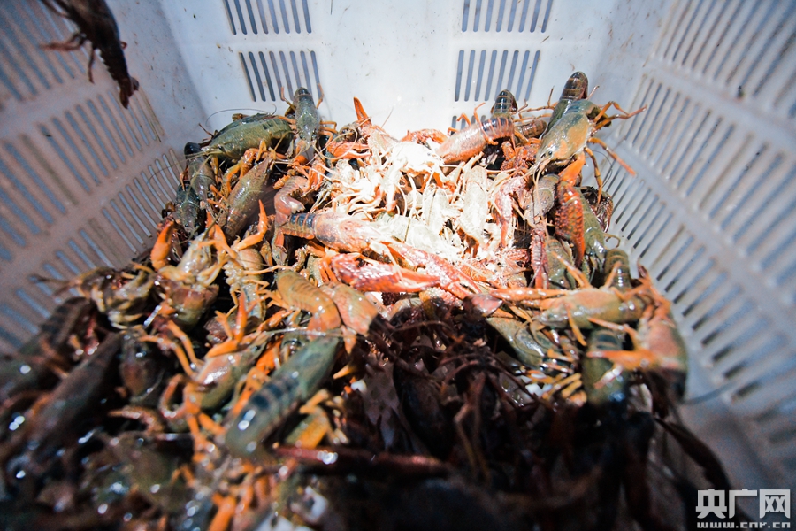 小龍蝦夜間出來(lái)活動(dòng),養(yǎng)殖戶會(huì)在下午將蝦食投喂完。(央廣網(wǎng)記者 官文清攝)