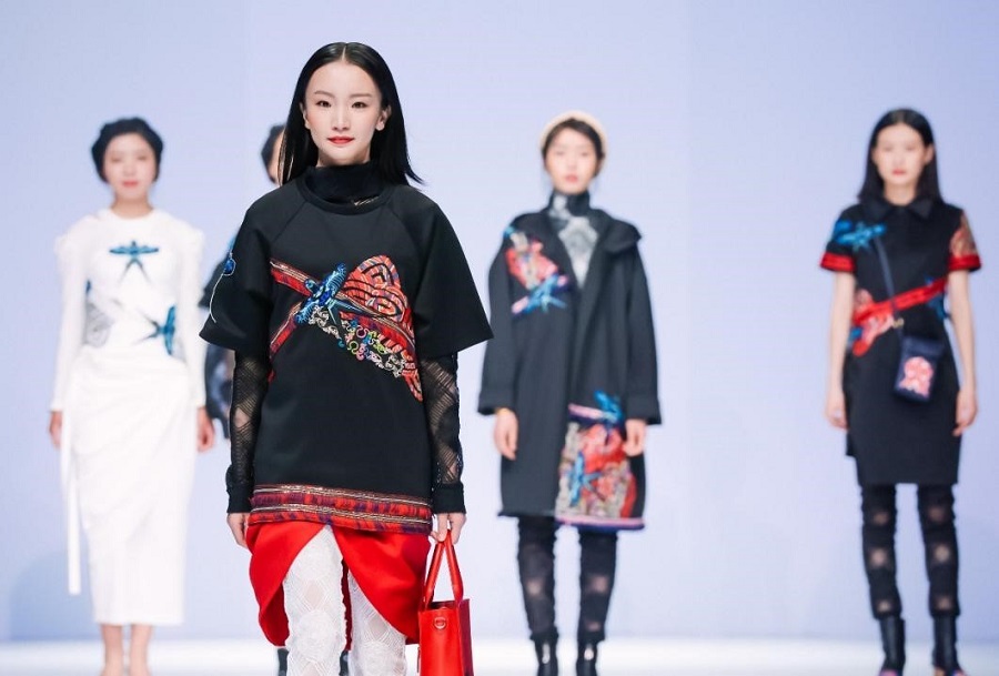 公益時裝秀以“民族等于潮流”為設(shè)計主題,將東鄉(xiāng)繡娘的民族傳統(tǒng)繡片與現(xiàn)代電腦印花及繡花結(jié)合貫穿整場發(fā)布。