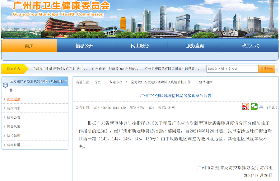 央廣網(wǎng)廣州6月26日消息(記者 張勝強(qiáng))6月26日下午,廣州市衛(wèi)健委先后發(fā)布《廣州市個別區(qū)域疫情風(fēng)險等級調(diào)整的通告》和《廣州市部分區(qū)域疫情風(fēng)險等級調(diào)整的通告》。據(jù)通報,南沙區(qū)、荔灣區(qū)、白云區(qū)的四個區(qū)域調(diào)整為低風(fēng)險地區(qū)。目前廣州全市中風(fēng)險地區(qū)清零。