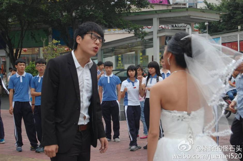 10月20日,深圳東門(mén)老街步行街前,一位準(zhǔn)新郎正等待他的準(zhǔn)新娘一起拍婚紗照。誰(shuí)知準(zhǔn)新娘將自己扮成70歲老太,問(wèn)男友70歲是否會(huì)愛(ài)她,并要以老年妝與其拍照。男子要求女友重新妝扮未果,當(dāng)街怒吼揚(yáng)長(zhǎng)而去,只留女子當(dāng)街痛哭。圖片來(lái)源:新浪微博
