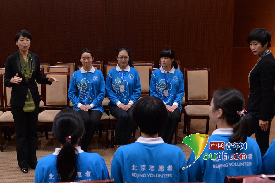 2014年10月24日,北京,志愿者在進行形體和禮儀的相關(guān)培訓。圖片作者:京華時報 王苡萱/CFP