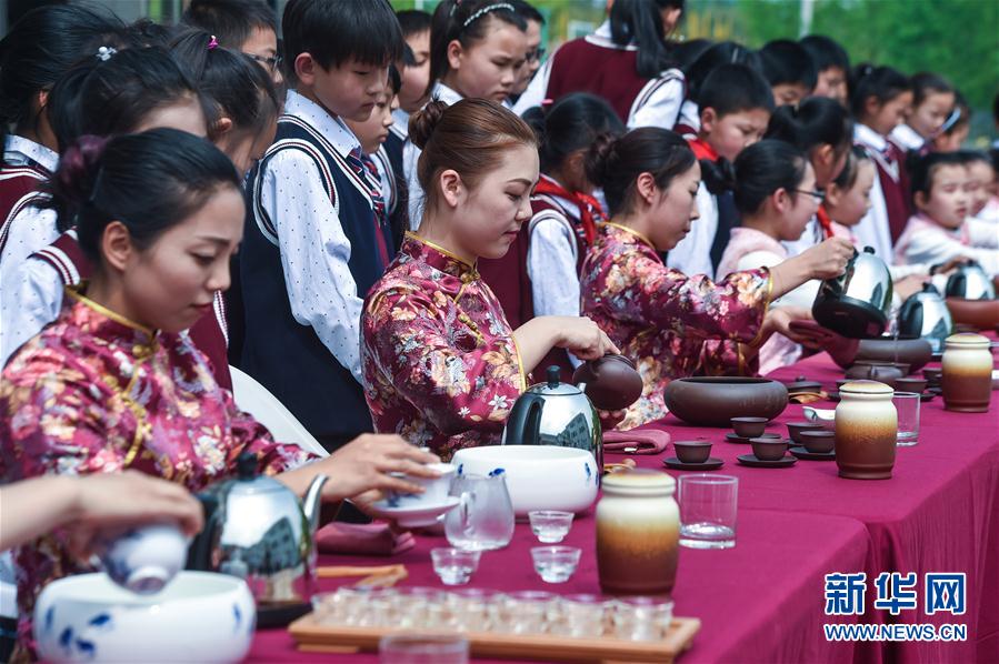4月20日,水口鄉(xiāng)中心小學(xué)擁有茶藝師證的老師們在給學(xué)生示范傳統(tǒng)茶藝。當(dāng)日,浙江省長興縣水口鄉(xiāng)中心小學(xué)舉辦校園特色“茶文化日”,全校700多名學(xué)生參與包括采茶、紫砂壺制作、茶藝表演等活動(dòng),讓孩子們從小學(xué)習(xí)、傳承傳統(tǒng)茶文化。新華社記者 徐昱 攝