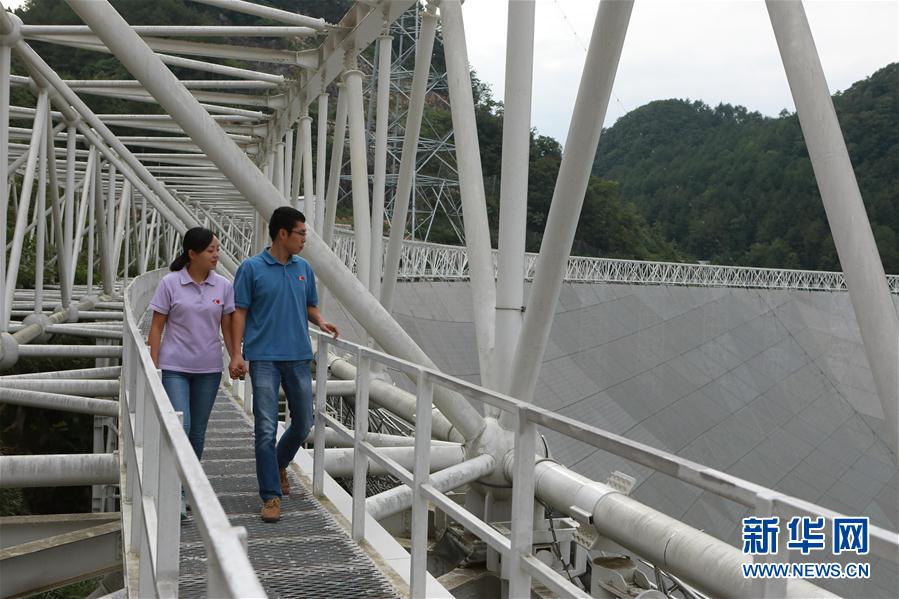 •      孫純(左)與石向瑋在FAST總控室內觀看FAST全景圖(8月9日攝) 新華社記者張傳奇 攝   在世界最大單口徑射電望遠鏡——500米口徑球面射電望遠鏡(FAST)項目組,光信息科學專業畢業的孫純和熱能與動力工程專業畢業的石向瑋因FAST結緣,在今年7月完婚。他們的結合,被同事們戲稱為“光”與“熱”的結合。