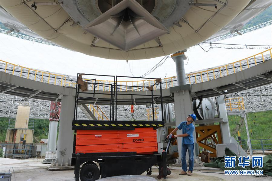•      8月10日,石向瑋在FAST饋源艙前作業。新華社記者張傳奇 攝