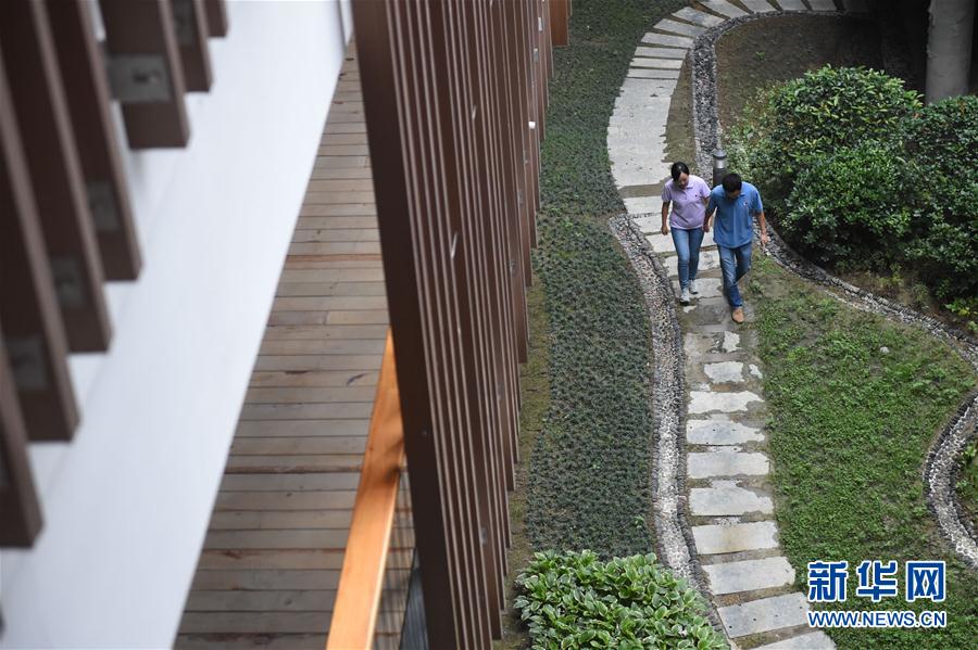 •      孫純(左)與石向瑋在公寓內綠化帶上散步(8月9日攝)。新華社記者歐東衢 攝