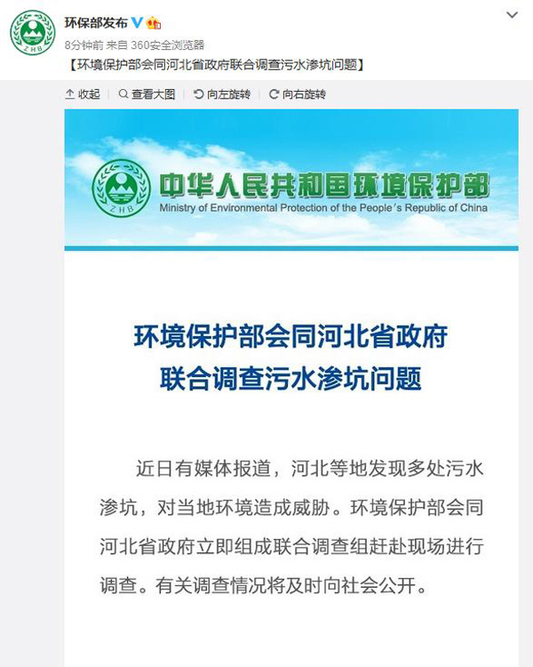 據(jù)環(huán)境保護(hù)部宣傳教育司官方微博消息,近日有媒體報(bào)道,河北等地發(fā)現(xiàn)多處污水滲坑,對(duì)當(dāng)?shù)丨h(huán)境造成威脅。環(huán)保部會(huì)同河北省政府已成立聯(lián)合調(diào)查組趕赴現(xiàn)場(chǎng)進(jìn)行調(diào)查。據(jù)介紹,有關(guān)調(diào)查情況將及時(shí)向社會(huì)公開(kāi)。