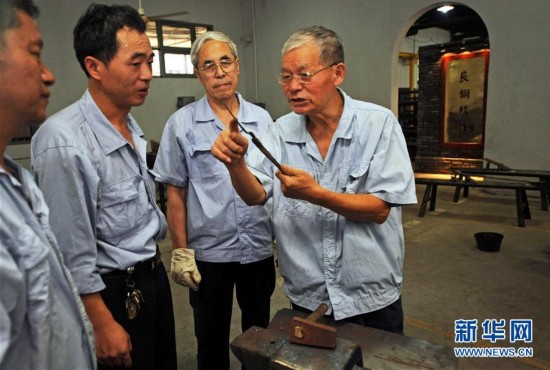 在杭州張小泉集團手工生產線上,“張小泉剪刀鑲鋼鍛制技藝”傳承人施金水(右一)在介紹制剪的“打下角”工序(2010年8月20日攝)。張小泉剪刀品牌始創于清康熙二年(1663年),其獨創的72道制剪工序讓張小泉剪刀數百年長盛不衰。