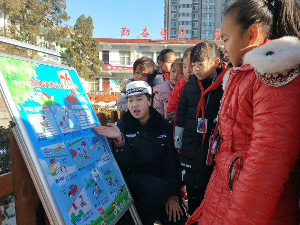 進(jìn)入2018年,連續(xù)下雪道路冰凍,登封交警制作出雨雪冰凍天氣出行安全提示宣傳圖版,走進(jìn)該市各小學(xué),F(xiàn)場講解,受到家長和學(xué)校師生的歡迎。