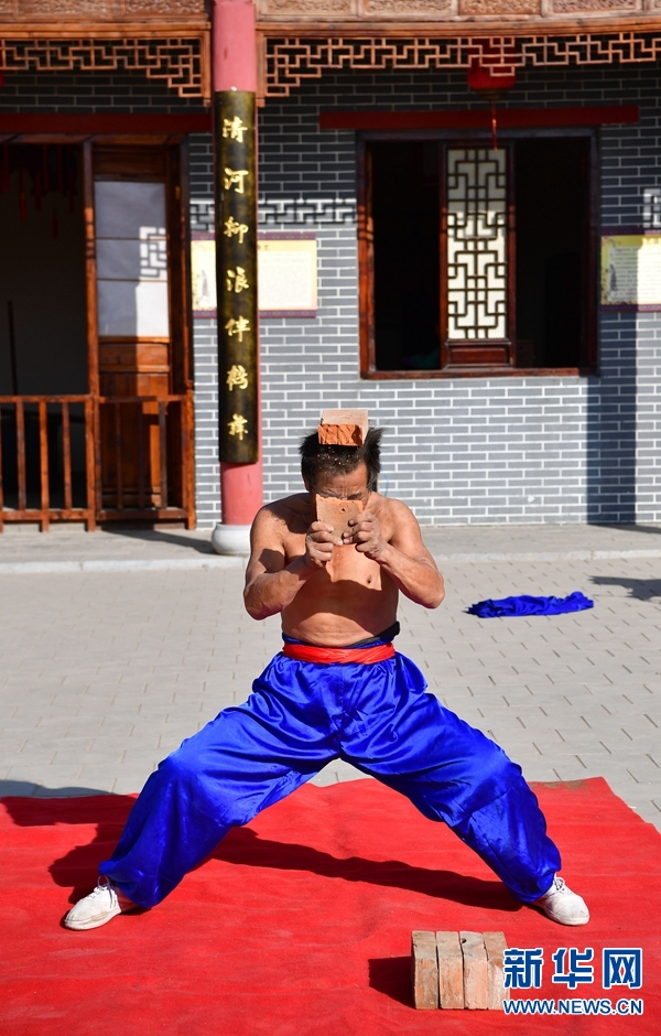 在河南省濮陽市華龍區岳村鄉東北莊村一個雜技小院,一位藝人表演硬氣功“劈磚”(11月22日攝)。 中原地區是中國雜技的主要起源地之一,中原雜技首推河南濮陽,濮陽雜技源自東北莊。東北莊同河北吳橋并稱為“中國雜技南北故里”。 如今的東北莊,村里以雜技為主題的文化墻到處都是,雜技小院每天熱鬧非凡,明清小巷依然有不少孩童在練習,專業雜技學校迎來四海學員……雜技,讓古老的東北莊煥發生機和活力,也在改變著這里人民的生活。 新華社記者馮大鵬攝 -