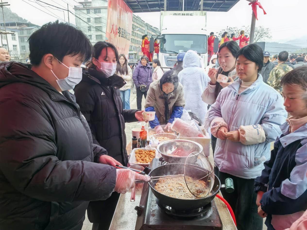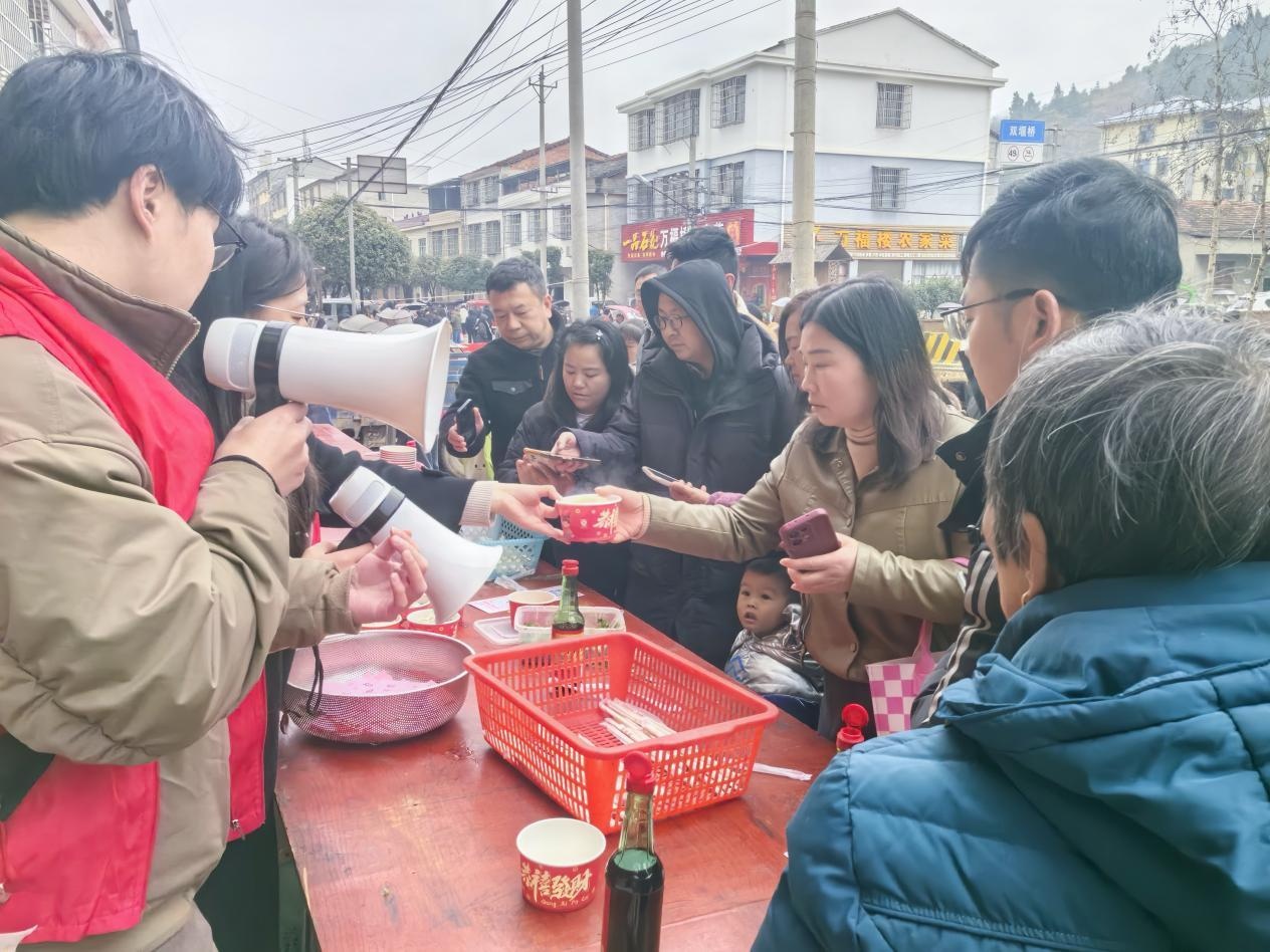沿著500米長的街道,百余個攤位分列兩旁,人們摩肩接踵。“肉丸25元一斤,剛出鍋的!”“柏樹枝熏了30年的老臘肉,包你下飯!”叫賣聲、詢價聲此起彼伏。村民周靜紅的炸丸攤位前排起長隊,她一邊麻利地撈丸,一邊收錢,額頭上沁出汗珠。攤主謝新江的臘貨攤前,臘肉臘魚油亮誘人,顧客爭相挑選。據統計,當天共售出香豬13頭、黃牛7頭、跑山羊5頭、塘魚1500余斤。從城區驅車而來的鎮芳華,提著沉甸甸的黃牛肉、酸菜、土鴨蛋等感慨道:“這些都是小時候的味道,買的是鄉愁。”