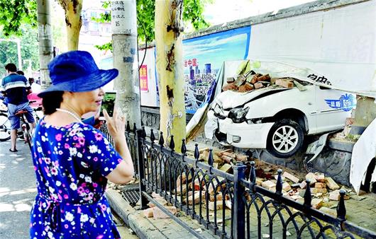 昨日上午11時許,學員李先生坐在江岸區匯通路一處駕校的辦公板房旁忐忑不安,幾分鐘前他練車時將油門當剎車,把駕校的院墻撞出比門框還大的洞。