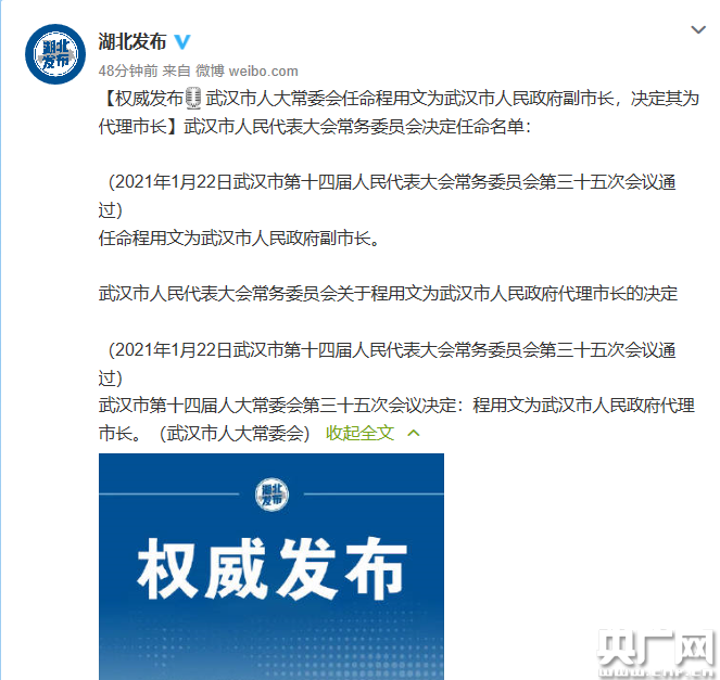 央廣網武漢1月22日消息(記者黃炎秋)據湖北省人民政府新聞辦公室官方微博“@湖北發布”消息,程用文任武漢市人民政府副市長、代理市長。