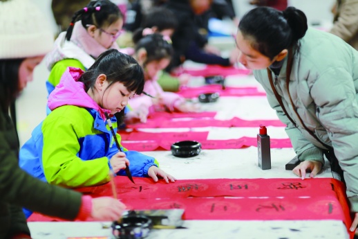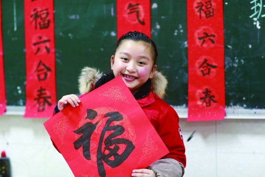 1月12日,衡陽市青少年宮,小朋友在展示、書寫“福”字和春聯。當天,該青少年宮開展寫春聯、送祝福活動,讓青少年在參與中增強對春節的認知,傳承中華優秀傳統文化。