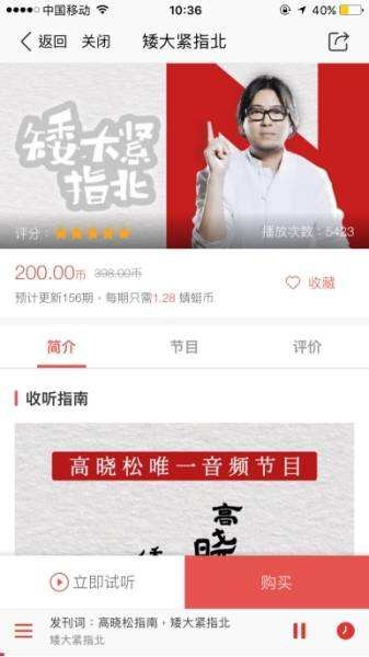 6月12日,蜻蜓FM推出《矮大緊指北》,一檔由高曉松聊"詩與遠方"的音頻付費節目火了。此前,《曉說》、《曉松奇談》等節目為高曉松積累了一票粉絲,已然成為具有號召力的強勢IP。此前,蜻蜓FM上線的高曉松免費音頻,累計播放量達9億。這些前期的免費內容已經為高曉松的IP質量打下了基礎,粉絲不需要擔心購買的內容是不是自己所需要的,不需要戰戰兢兢擔心內容質量是否優秀且穩定,高曉松提供的知識+情懷已經順理成章的從免費走向付費。
