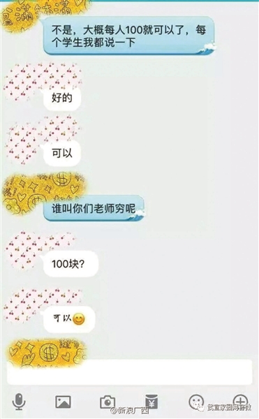 在被曝光的聊天記錄中,該老師曾表示,“大概每人100就可以了,每個學生我都說一下。”并解釋說,“誰叫你們老師窮呢?”聊天記錄顯示,群內多名學生回復稱,“可以。”