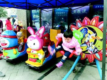 搖搖車的樂 放在商店前的搖搖車等街頭小型游樂設施,因乘坐價格便宜、造型卡通、色彩鮮艷,帶給低齡小朋友樂趣,受到不少小朋友的歡迎,圖為兩個小朋友搶坐一臺搖搖車。 本報記者 肖雨楊 攝