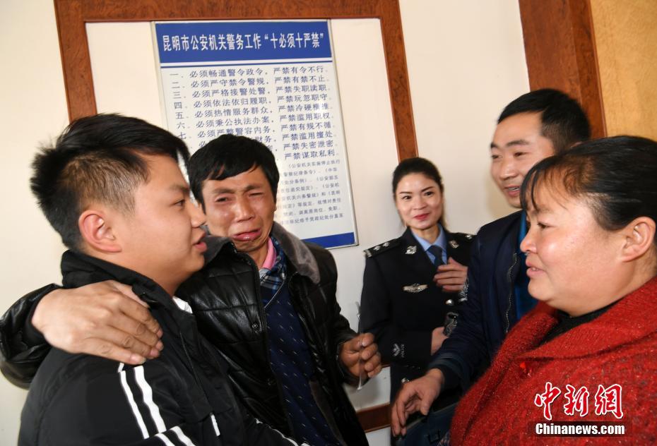 2月23日,小周和親生父母相見時,父母淚流滿面。當日,20年前在貴州省失蹤的周躍欽夫婦2歲半兒子小周,在貴州和云南兩省警方努力幫助下,通過DNA血樣比對成功,現在已經22歲的小周與自己的親生父母、弟弟在昆明團聚,一家人相擁而泣。這些年來,周躍欽夫婦一直沒有放棄找兒子,并將自己的DNA血樣在公安機關進行采集備案。為了找到親生父母,2016年,小周也在昆明市公安局進行了DNA和指紋采集。據介紹,采血入庫比對,是被拐孩子尋親的捷徑。中新社記者 李進紅 攝