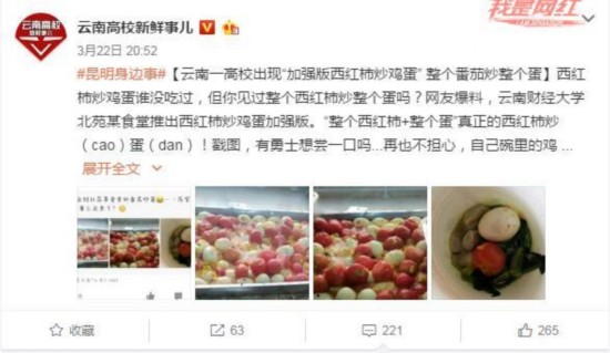 22日晚,微博用戶“云南高校新鮮事兒”發布了一條博文稱“網友爆料,云南財經大學北苑某食堂推出西紅柿炒雞蛋加強版,整個西紅柿+整個蛋”,引得微博用戶紛紛轉發。云南財經大學的學生們秒變“段子手”,紛紛在博文評論中吐槽、逗趣、認校友.....。。
