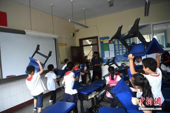 資料圖:9月25日,重慶南岸區天臺崗小學花園校區內舉行反恐防暴演練。圖為小學生們正在練習如何用身邊工具來保護自己。中新社記者 陳超 攝