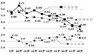 調(diào)查側(cè)重考察了兒童在應(yīng)急情境、情緒激動和正義需要援手情境中的冷靜品質(zhì),發(fā)現(xiàn)兒童冷靜品質(zhì)在遭遇不同情境中情緒調(diào)控性表現(xiàn)出不同的發(fā)展趨勢。在一般應(yīng)急情境和情緒激動中的兒童冷靜品質(zhì)分值有隨年齡增長而下降的趨勢,意味著兒童在應(yīng)急與情緒激動情境下隨著年齡增長而更容易沖動,不能控制自己;而在遇到有需要援手等正義需求情境時,兒童冷靜品質(zhì)的得分有隨年齡增長而升高的趨勢,意味著這種情況下,年齡越大的兒童越能控制自己的行為。