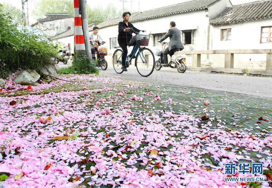 •   4月17日,一場春雨過后,蘇州市民騎車經(jīng)過落滿櫻花的盛家?guī)贰P氯A社發(fā)(王建中 攝)