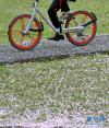 •   4月17日,一場春雨過后,一名游客在落滿花瓣的浙江省嘉興市南湖風景區(qū)內騎行。 新華社發(fā)(金鵬 攝)