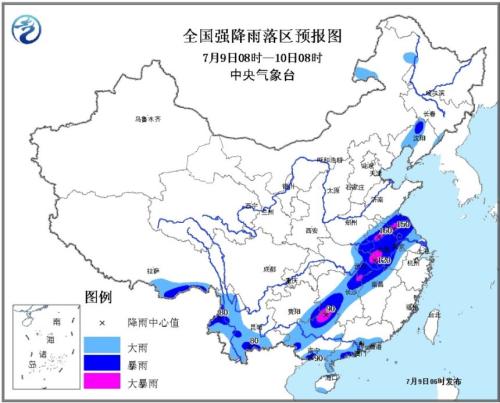 預計,7月9日08時至10日08時,江蘇、安徽、河南東南部、湖北東部、江西西北部、湖南西南部和東北部、貴州東南部、廣西北部和南部沿海、廣東南部沿海、云南中西部、遼寧西部等地的部分地區(qū)有大雨或暴雨,其中蘇皖北部、湖北東北部、廣西北部、湖南西南部等地局地有大暴雨(100~160毫米);上述部分地區(qū)有短時強降水,局地伴有雷暴大風等強對流天氣,最大小時雨強可達20~40毫米,局地超過60毫米。