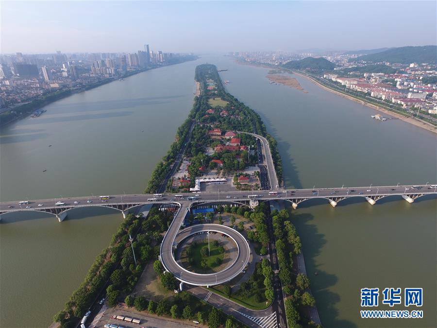 7月15日,長沙橘子洲大橋和橋下重新開園的長沙橘子洲景區。