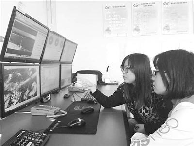 “慧眼”班組的航空氣象觀測員在分析衛星云圖。 本報記者 邢生祥 攝