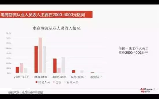 2016年5月,北京交通大學、阿里巴巴研究院、菜鳥網絡聯合發布《全國社會化電商物流從業人員研究報告》顯示,53.4%的快遞站點員工月平均工資在2000-4000元;近八成一線快遞員日均工作9-10小時,有些甚至12小時以上。