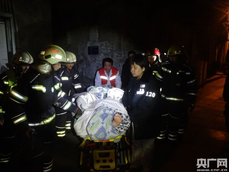 征得現場人員的同意后,消防員對房門進行了破拆。進入屋內后發現,屋內一個煤爐仍有余溫,兩人神志不清。隨后中隊官兵將房間內門窗打開,并配合醫護人員將兩人逐個抬到救護車上。
