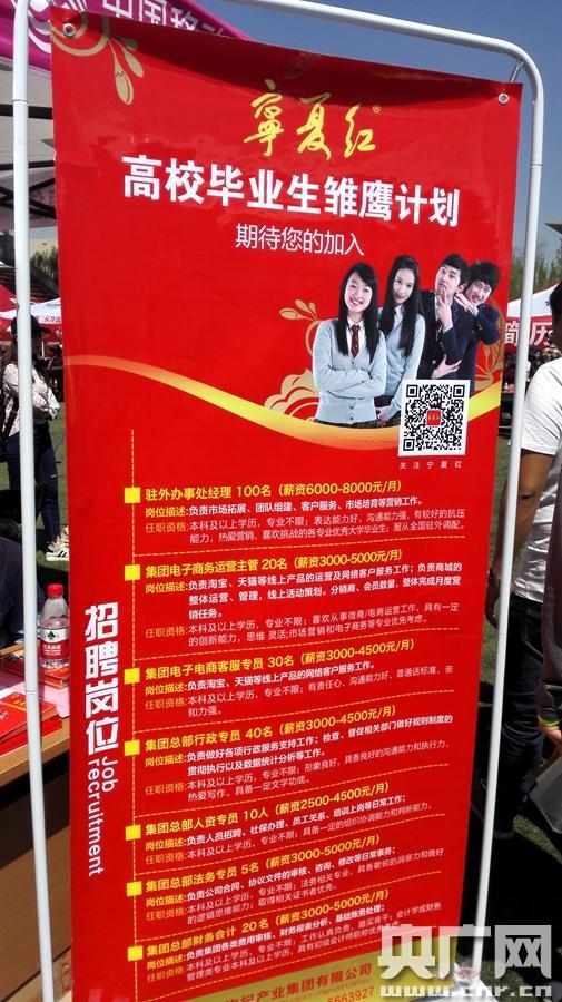 招聘廣告(央廣網(wǎng)記者許新霞 攝) 根據(jù)統(tǒng)計,崗位需求排前五的分別是培訓(xùn)教育、市場營銷、信息技術(shù)、生物化工和人資行政。活動當(dāng)天吸引了來自陜西、甘肅、內(nèi)蒙古及寧夏周邊地區(qū)高校畢業(yè)生近萬人次入場求職應(yīng)聘,達(dá)成意向性協(xié)議的占到五分之一以上。
