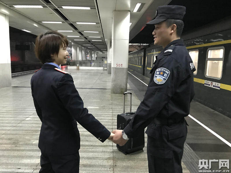 陳敏是廣鐵集團廣九客運段深烏車隊的一名列車廣播員,她愛人鄧軍湘是惠州鐵路公安處東莞東站派出所的一名執勤特警,倆人因鐵路結緣,相識相識相愛,今年春運前不久才領完證,喜酒都來不及擺,蜜月也來不及度,就馬上投入繁忙的春運工作。