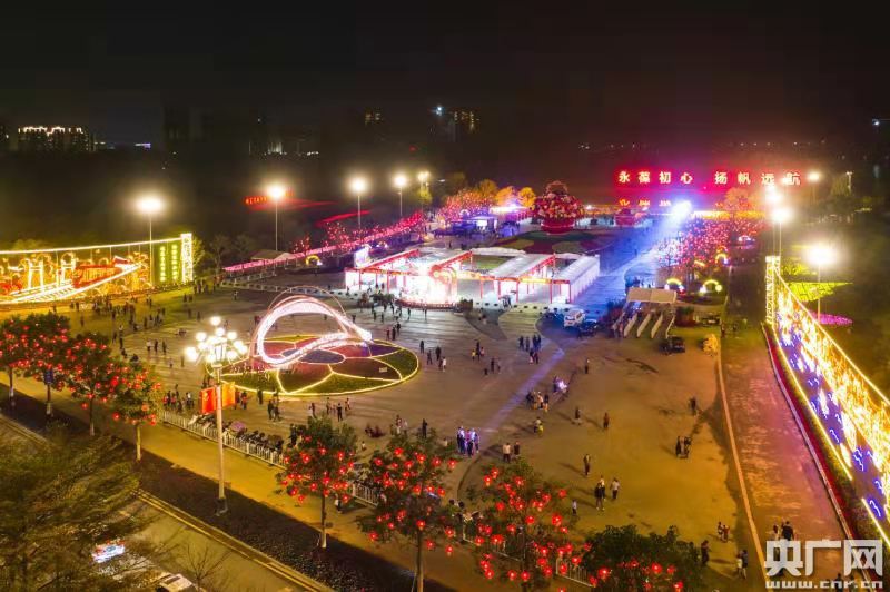 高達15米的大花籃是知識城分會場的亮點之一。待華燈初上,圍繞花籃萬盞燈籠點亮,呈現火樹銀花的勝景。