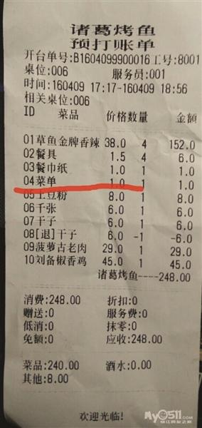 4月9日,鎮(zhèn)江市民馬先生帶著家人和朋友來(lái)到了鎮(zhèn)江城區(qū)大市口解放路新開(kāi)業(yè)的一家諸葛烤魚店,吃完結(jié)賬時(shí),店家告知一共消費(fèi)了248元,于是服務(wù)員向馬先生提供了一張賬單。細(xì)心的馬先生發(fā)現(xiàn)在收費(fèi)單上,除了馬先生一家人消費(fèi)的菜品、餐具以及餐巾紙的價(jià)格以外,第四項(xiàng)赫然寫著菜單的價(jià)格收費(fèi)一元。馬先生告訴記者,因?yàn)樯碳也](méi)有提前告知菜單需要收費(fèi),所以結(jié)賬時(shí)感到有點(diǎn)意外,而且之前也從來(lái)沒(méi)有遇到過(guò)這樣的情況。為此,馬先生向服務(wù)員提出了異議,對(duì)方表示菜單要收費(fèi)是老板定的,他們也沒(méi)有辦法。考慮到服務(wù)員是打工的,也不容易,之后也就沒(méi)多計(jì)較,菜單也并未帶走。因?yàn)橛屑胰撕团笥淹校瑸榱瞬黄茐臍夥,最終并未找老板詢問(wèn)菜單要收費(fèi)的緣由。