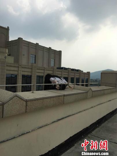 圖為“盤踞”無錫某商場樓頂多日的長發人體模型。 秦崢 攝