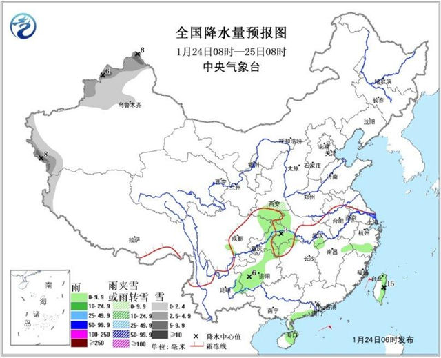 24日08時至25日08時,新疆北部與西南部的部分地區(qū)有小到中雪,局地大雪;陜西南部、四川盆地西南部和東北部、重慶中東部、湖北西部、貴州中西部、海南島、臺灣等地的部分地區(qū)有小雨或陣雨,局地中雨。臺灣海峽、南海東北部和中東部偏北海域有7~8級、陣風(fēng)9~10級的東北風(fēng)。