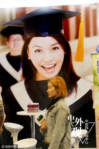 2016年10月22日,北京中國國際教育展上,出國留學展臺,學士服畢業照。視覺中國