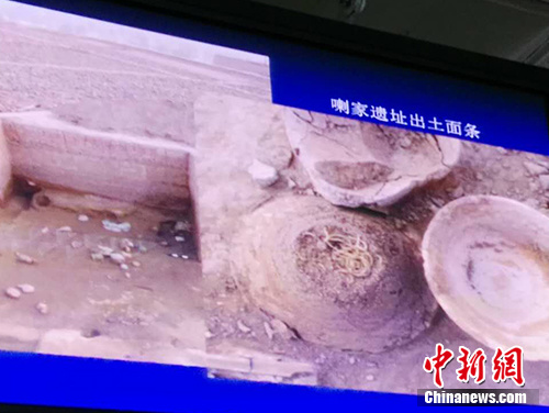 王仁湘在講座中展示的喇家遺址出土面條。中新網記者 宋宇晟 攝