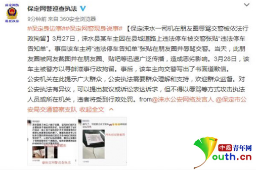 中國(guó)青年網(wǎng)北京3月29日電(記者 李永鵬 見習(xí)記者 劉利影)近日,河北省保定市淶水縣某車主因3月26日在縣城道路上違法停車,被值勤民警張貼“違法停車告知單”。事后,該車主將“違法停車告知單”配以辱罵性的文字在“朋友圈”發(fā)布并號(hào)召他人轉(zhuǎn)發(fā)。3月28日,該車主因?qū)め呑淌卤痪叫姓辛簟J潞螅撥囍鲗懗隽藭娴狼感拧?/p>